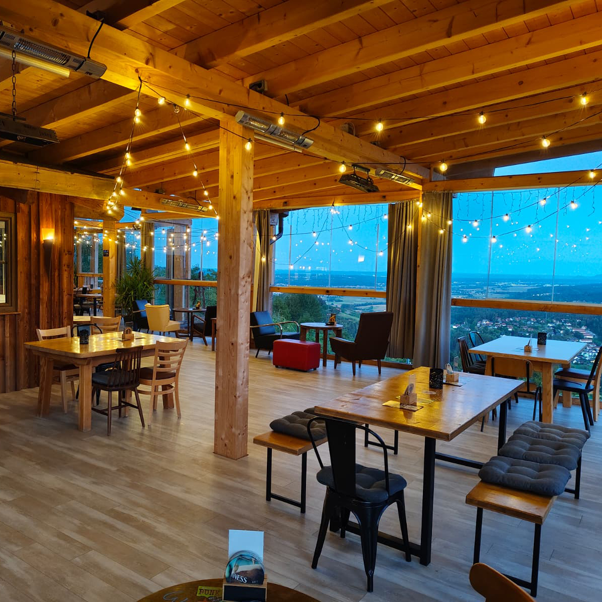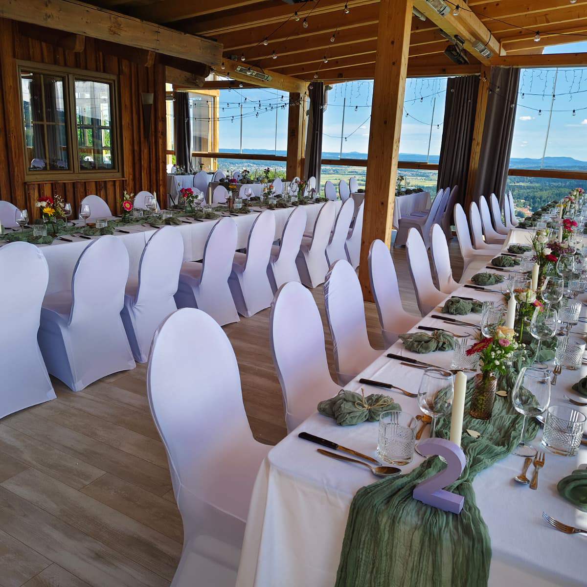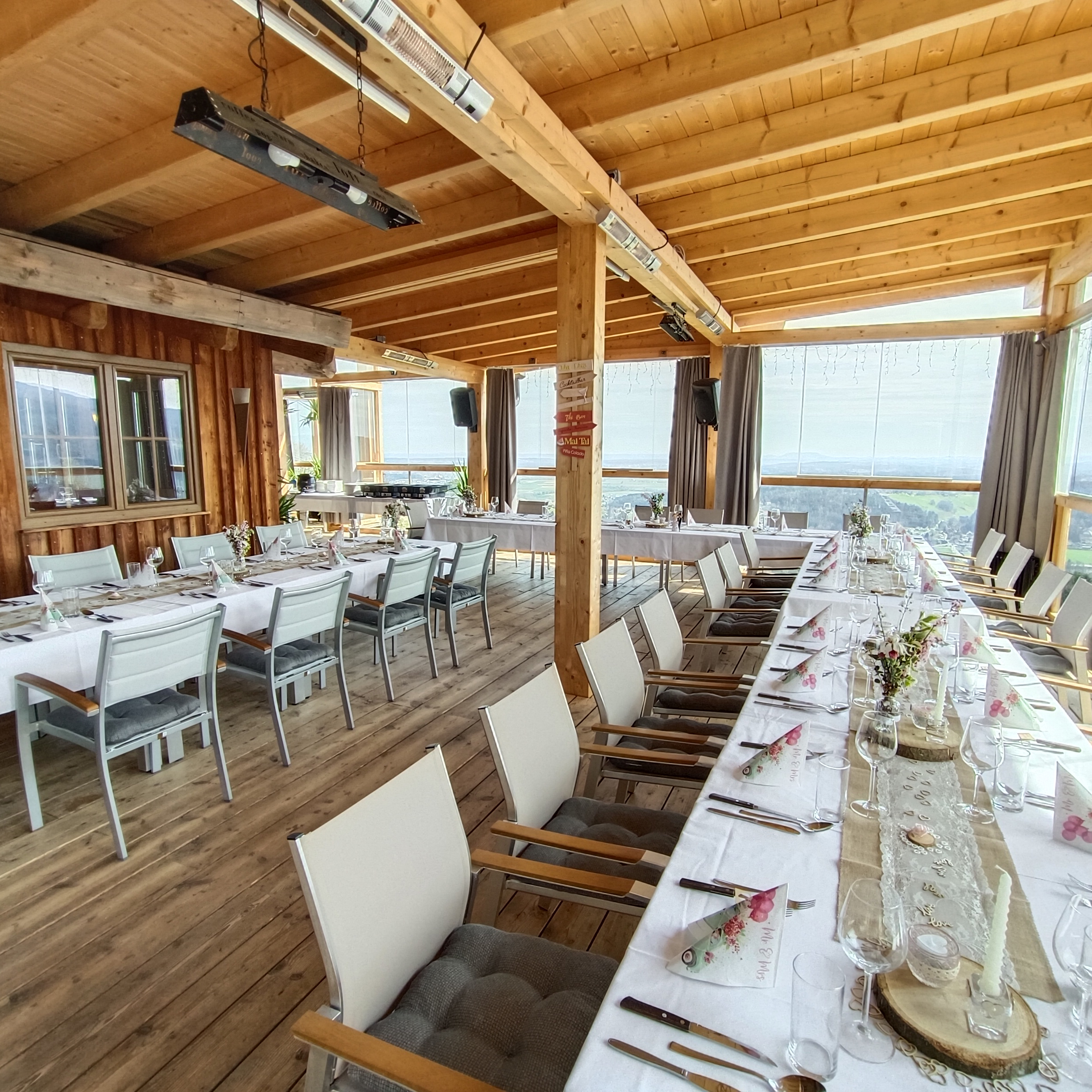 Unsere Terrasse begeistert mit einer atemberaubenden Aussicht und bietet reichlich Platz für große Feiern wie Hochzeiten oder Firmenevents.